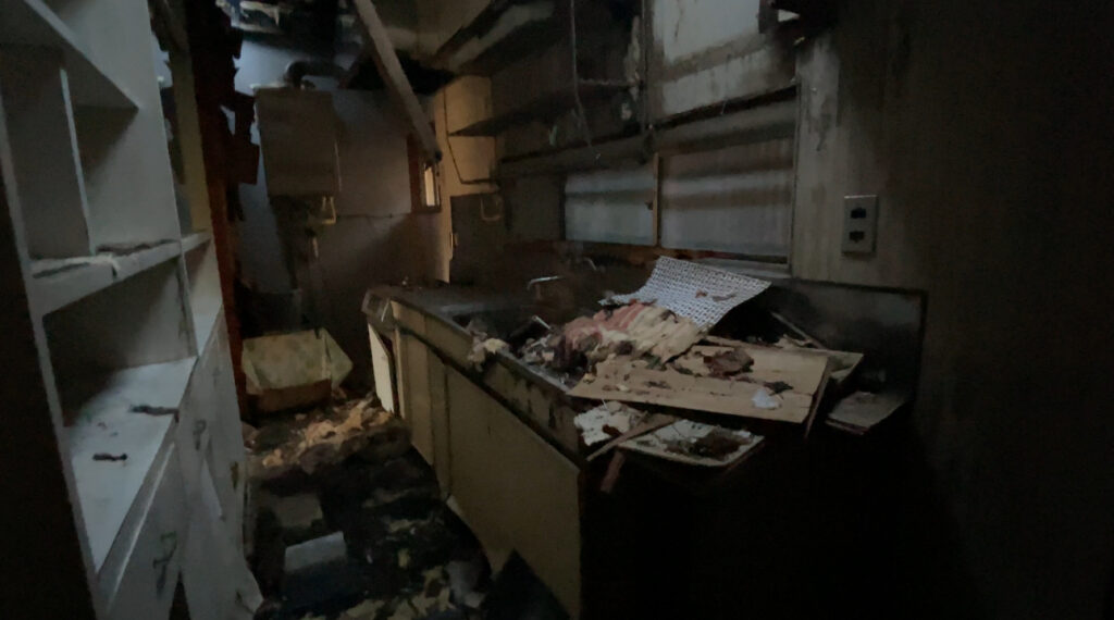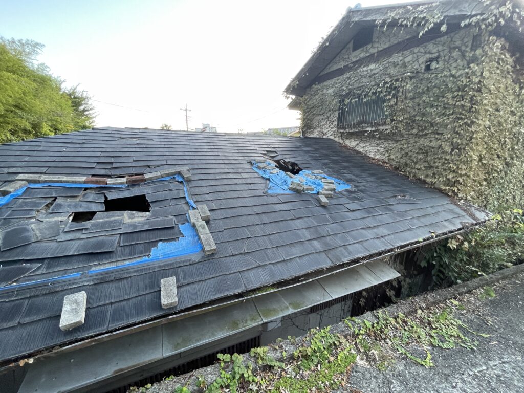 屋根に穴空いてるので、中は悲惨ですね。。。